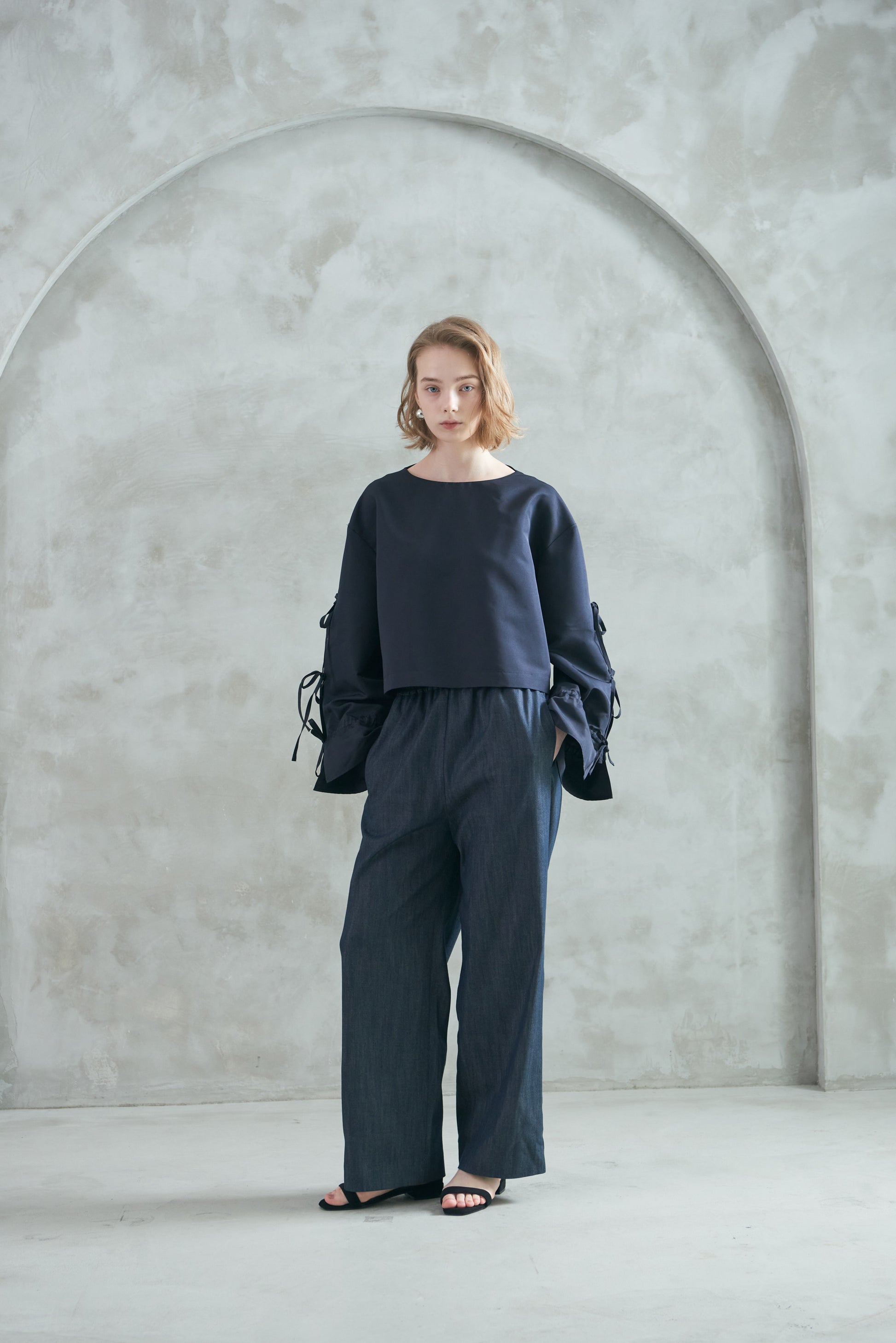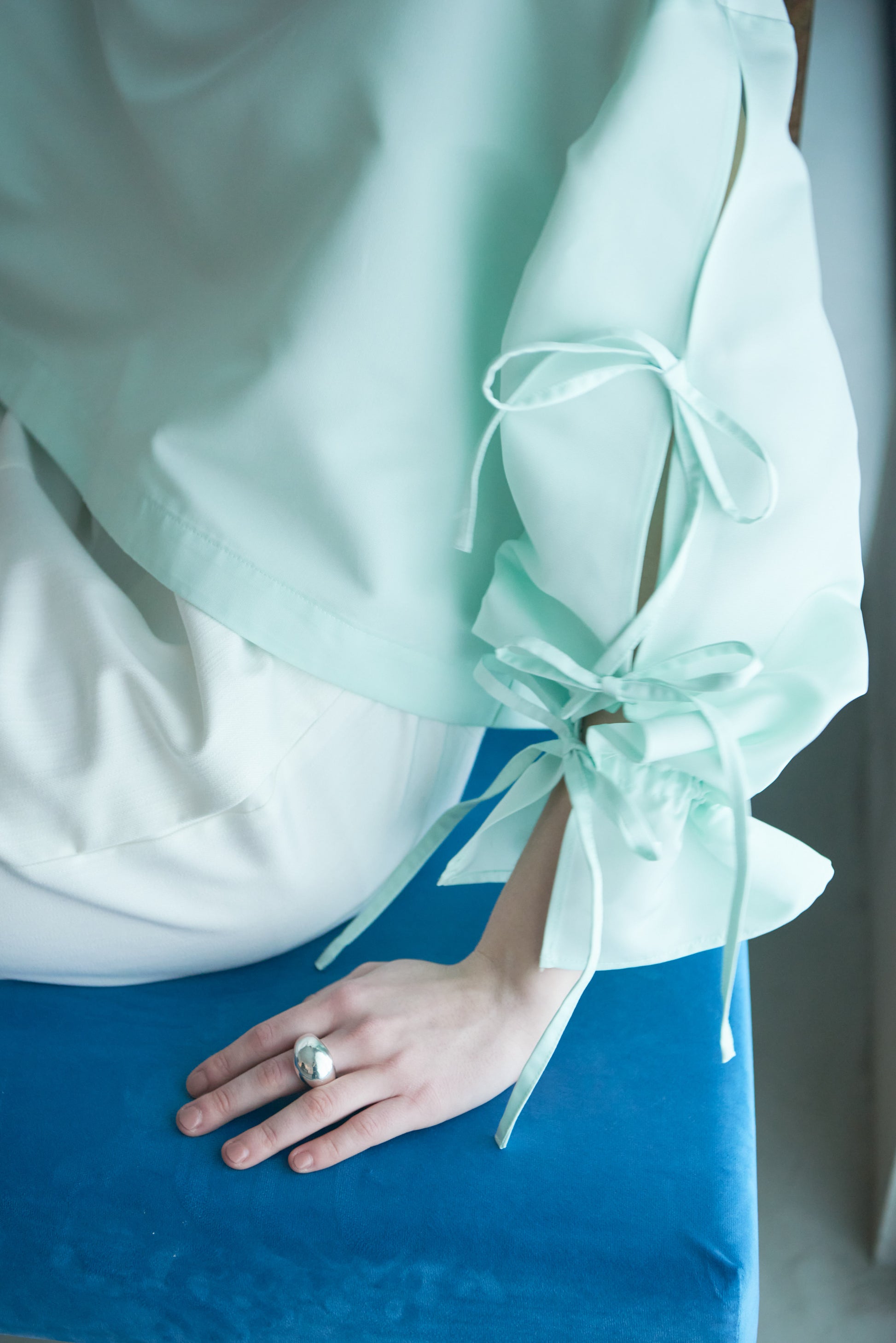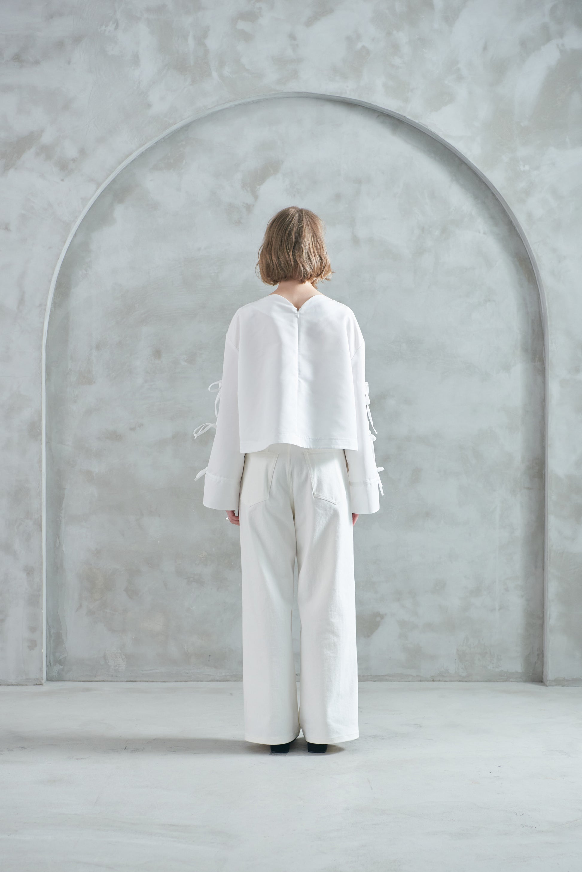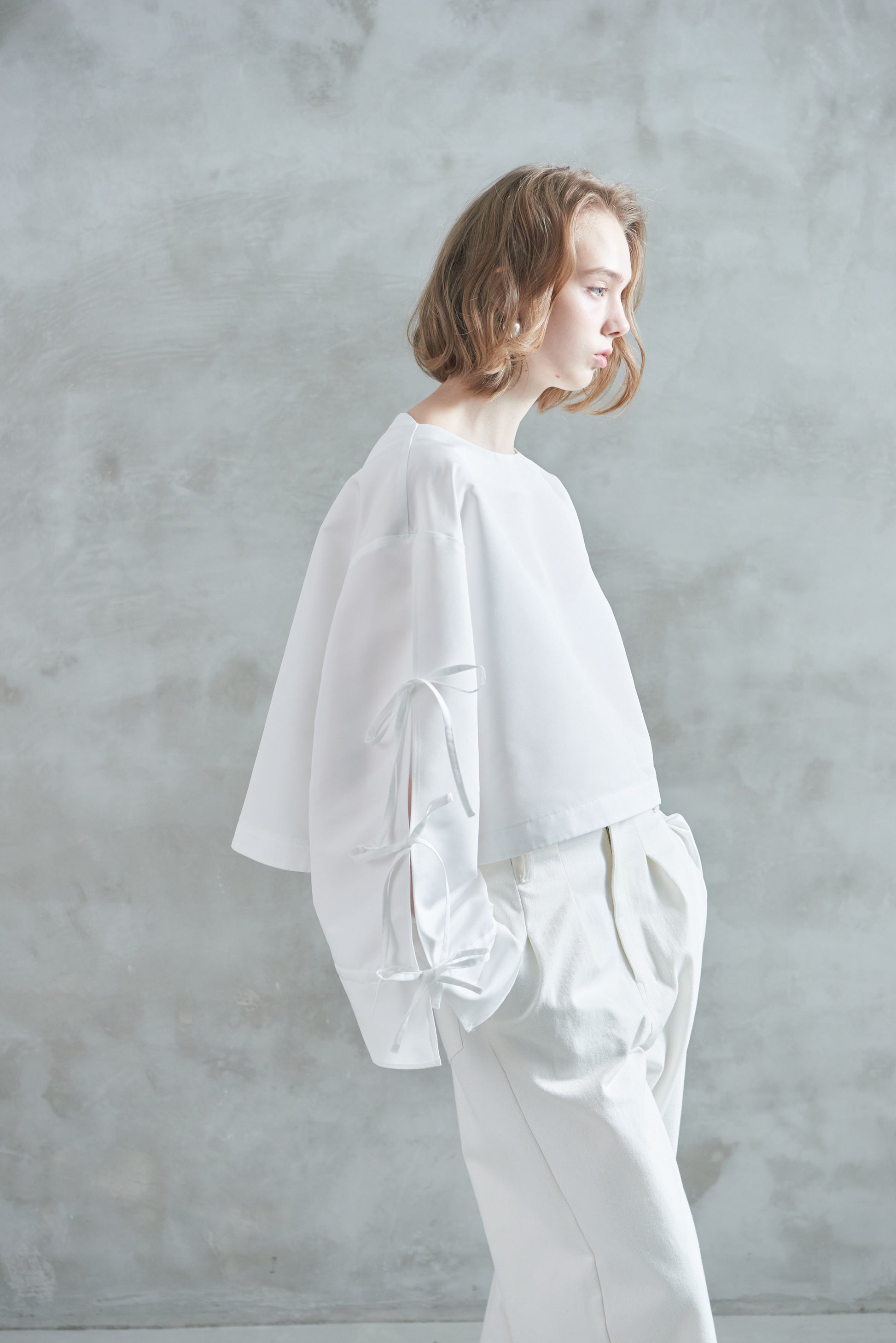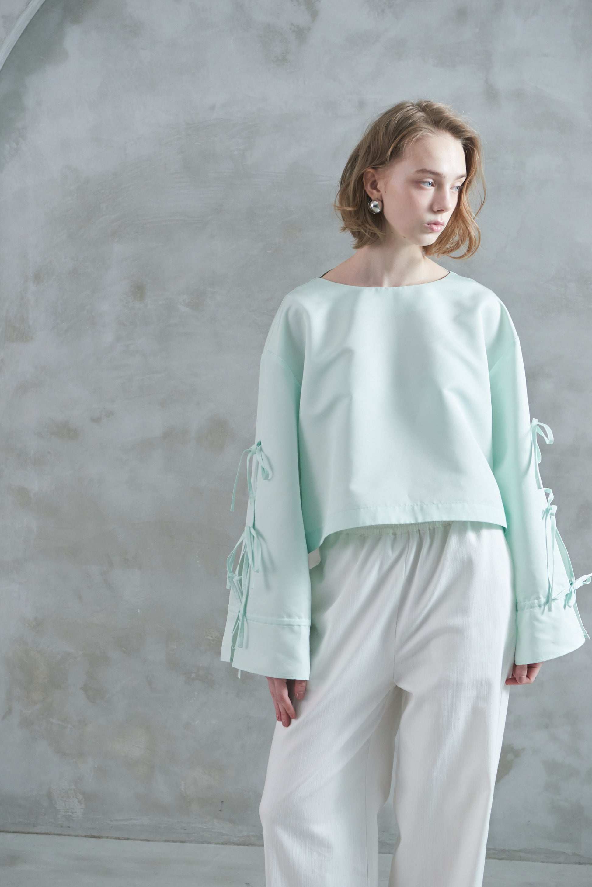袖口のリボンは絞ってシルエットを変えたり、そのままラフに着たりと、気分やスタイリングに合わせてアレンジも可能。