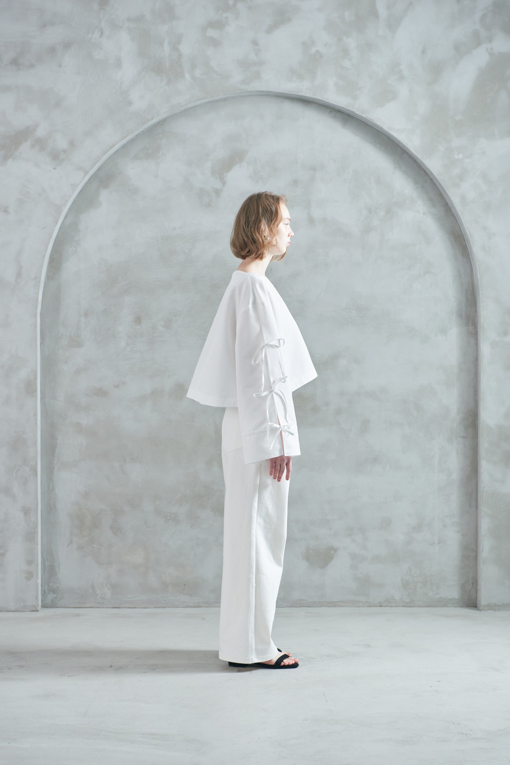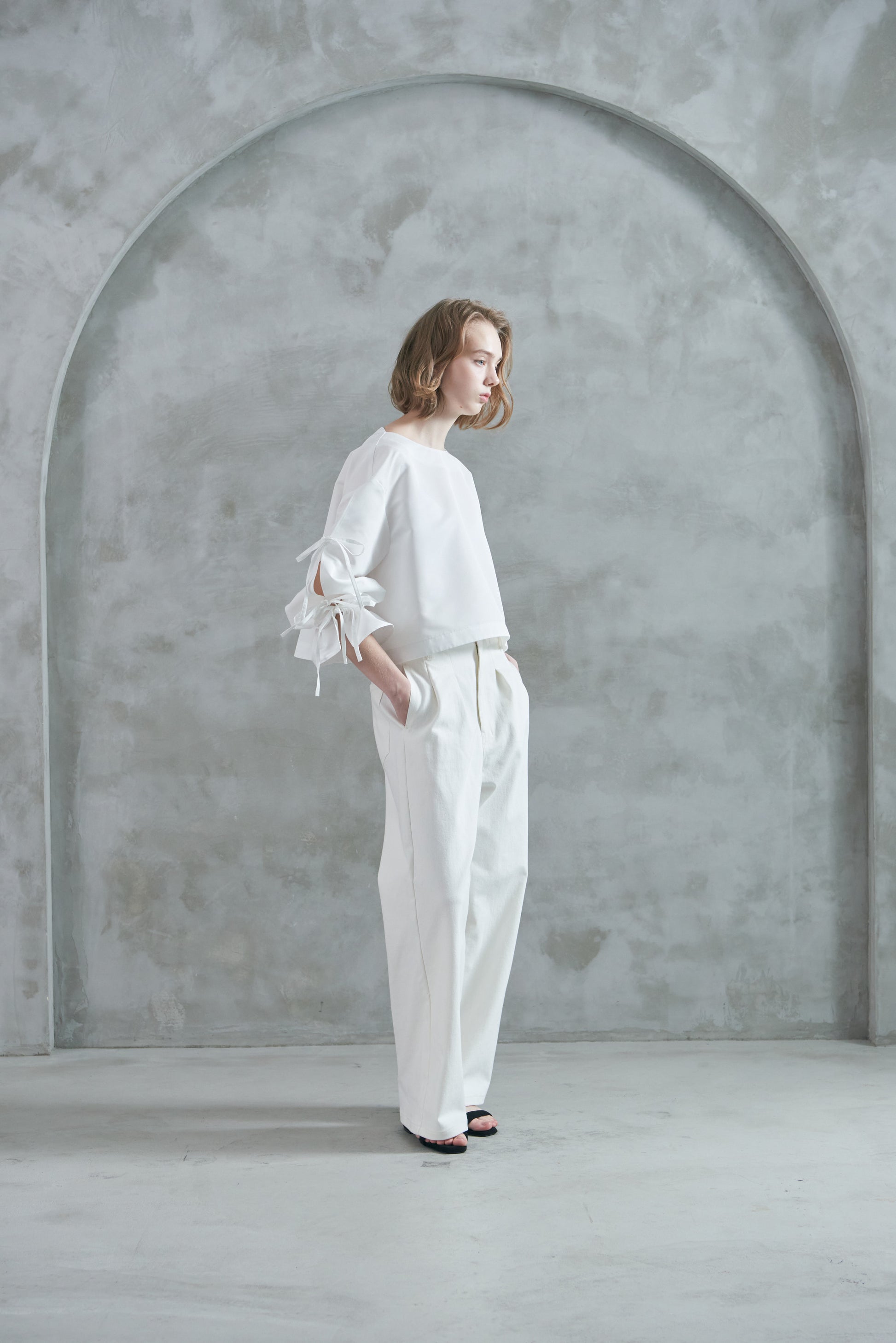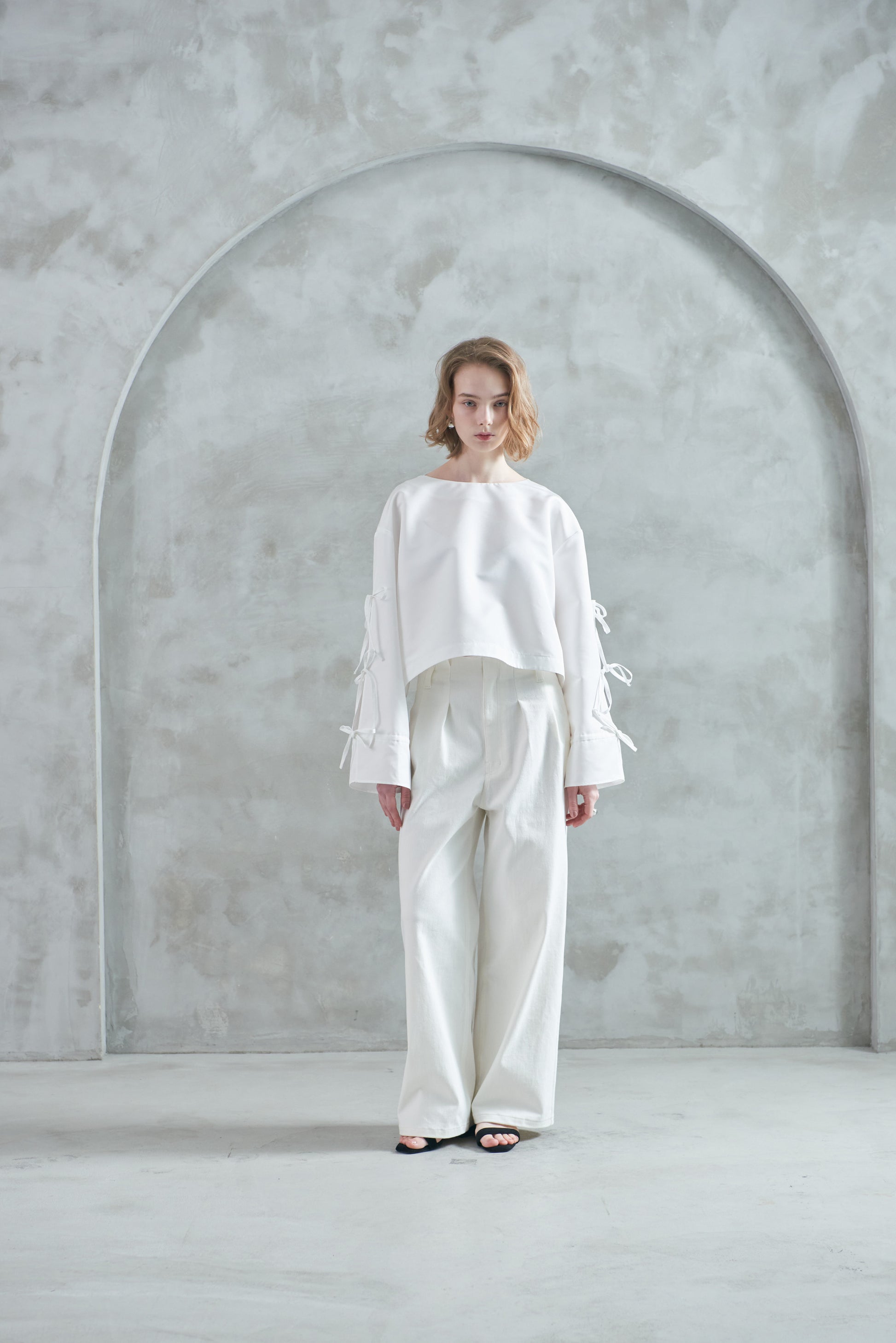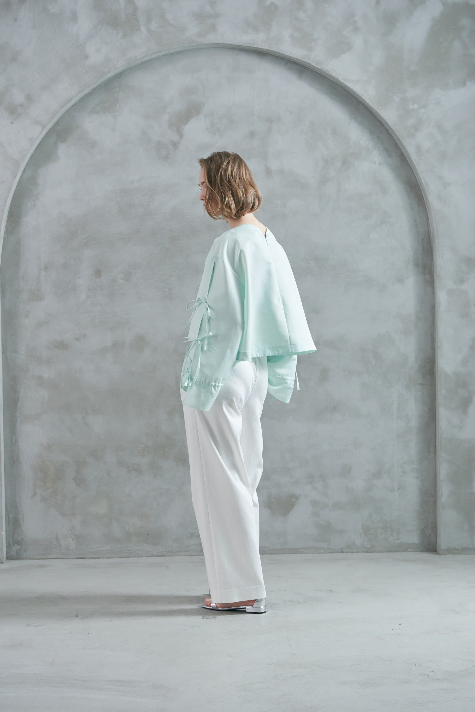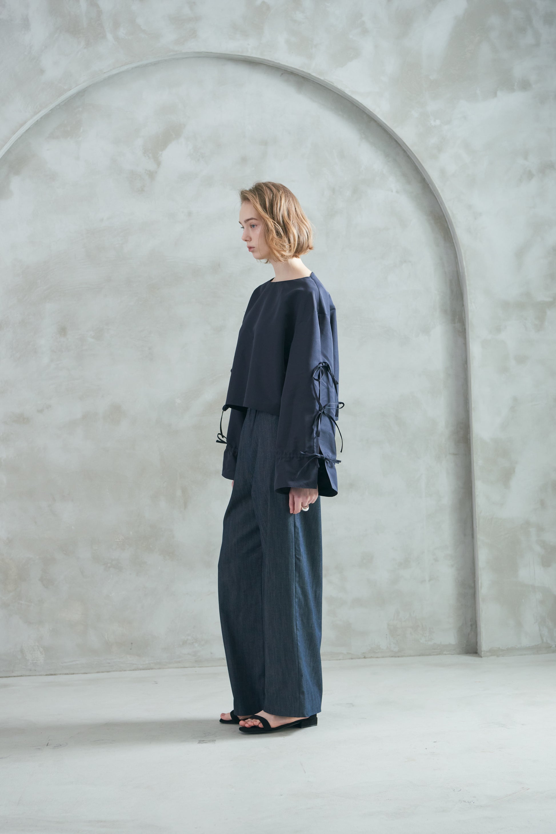 袖口のリボンは絞ってシルエットを変えたり、そのままラフに着たりと、気分やスタイリングに合わせてアレンジも可能。