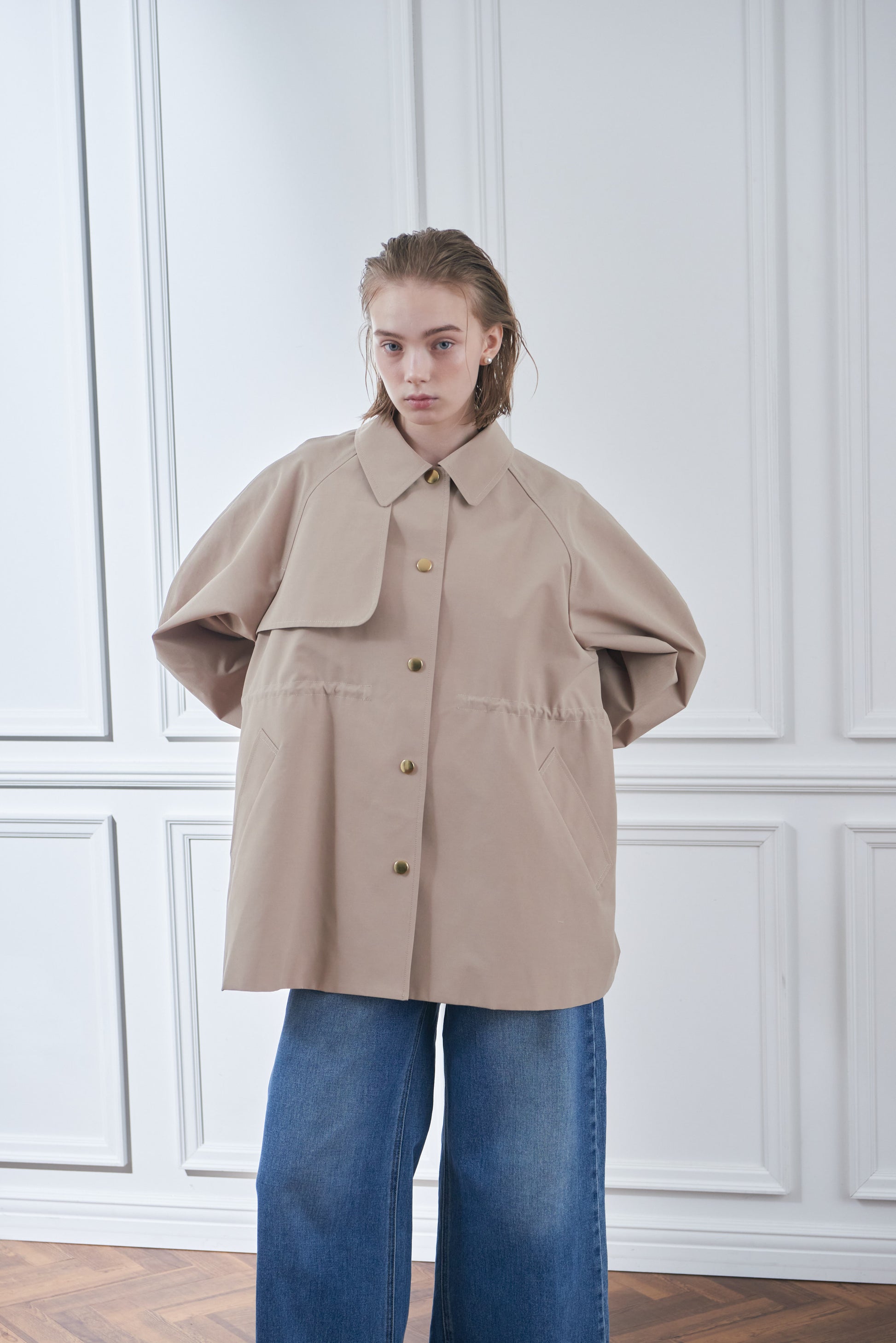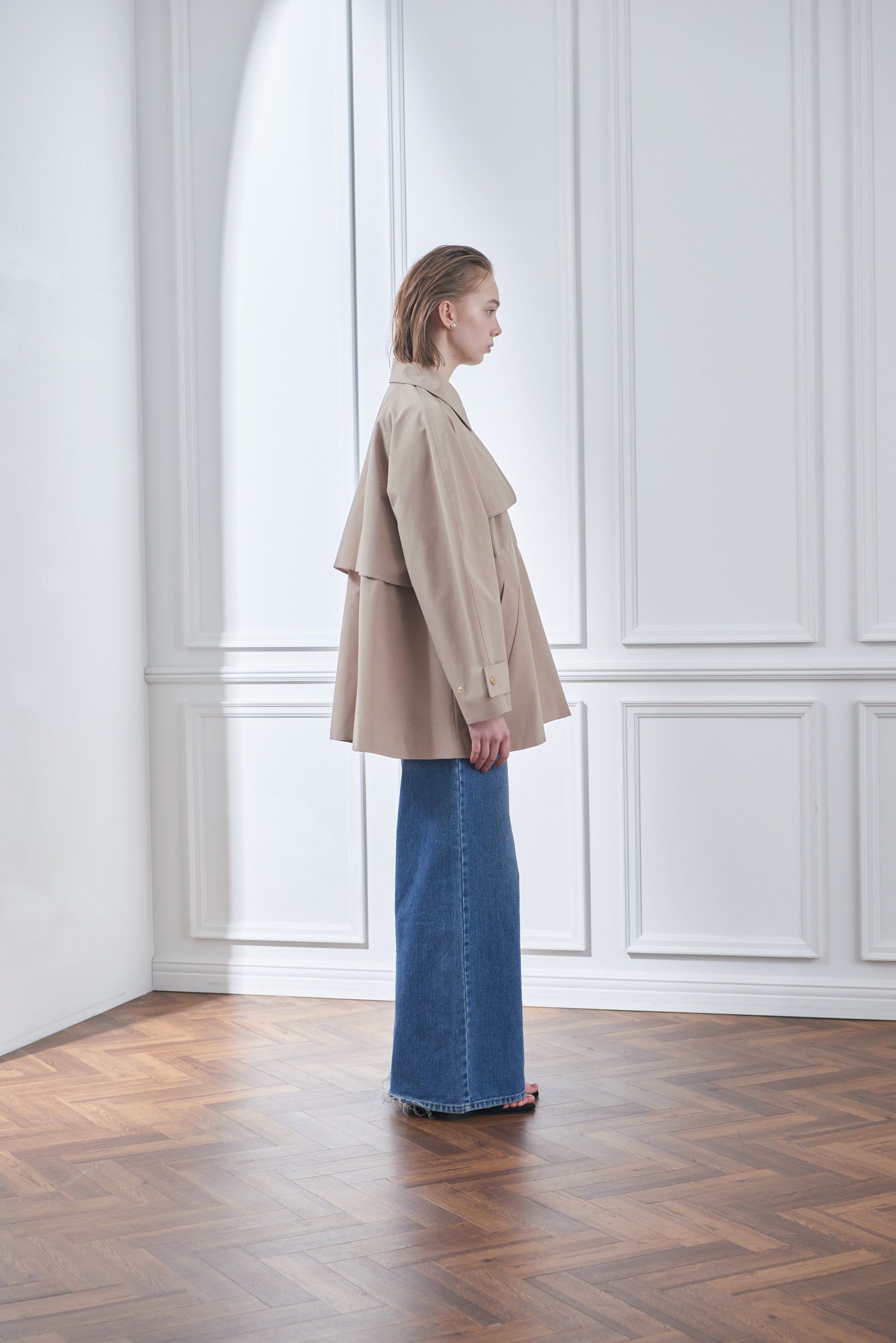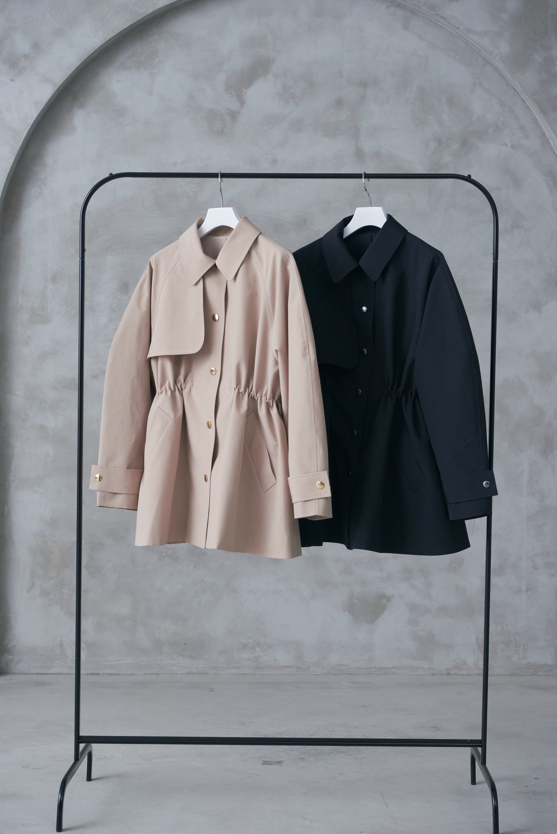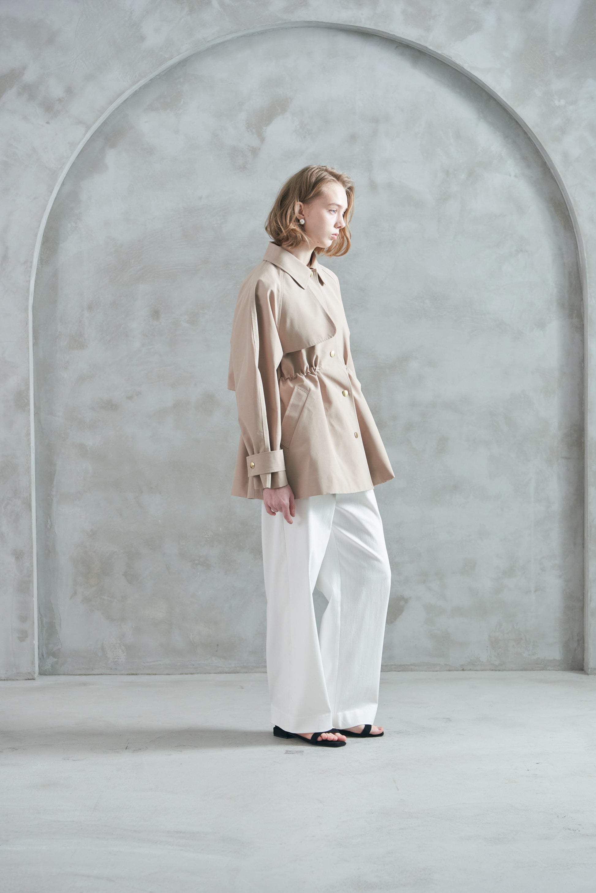 そのまま羽織ると、Aラインのシンプルなトレンチコートとしても着用でき、バストや袖にもゆとりを持たせているため、動きやすく気負わず着ていただけます。