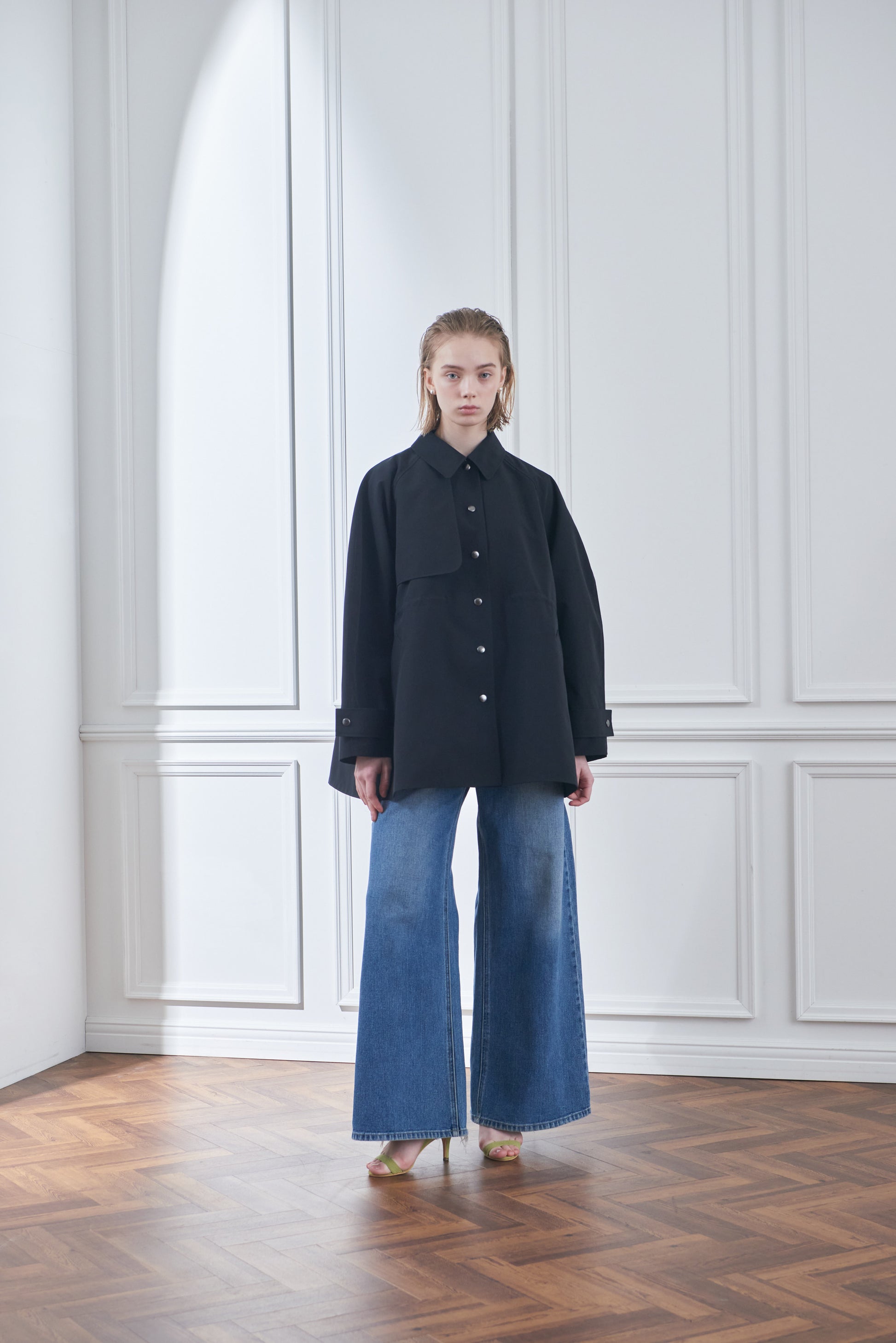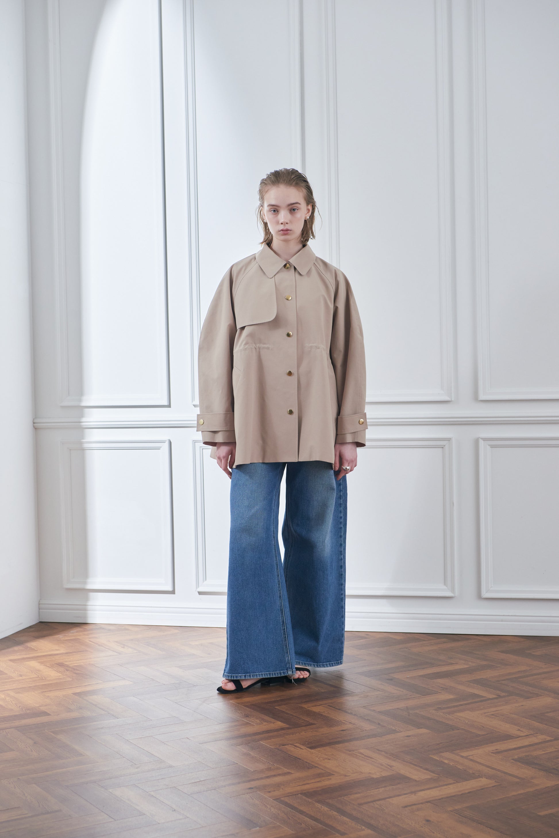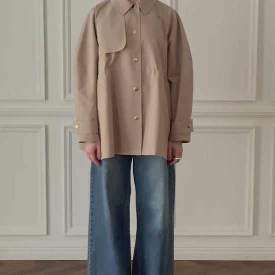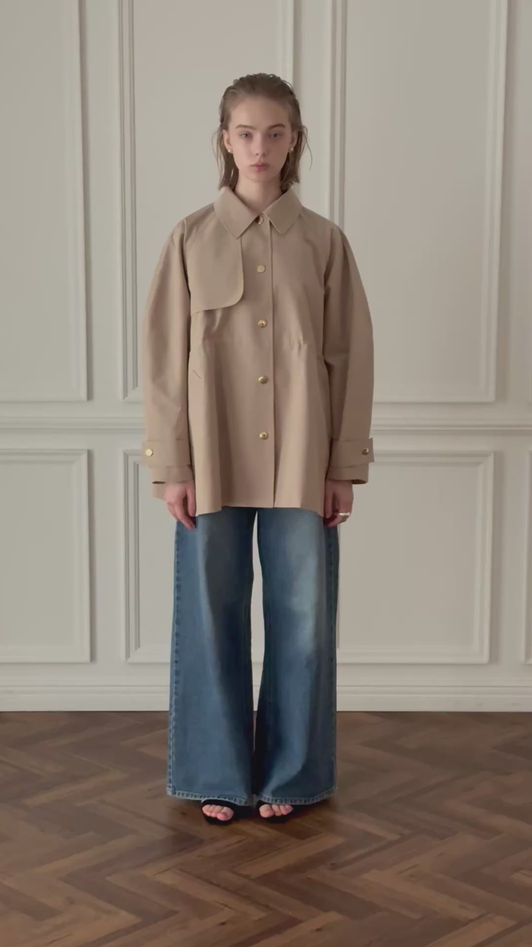 そのまま羽織ると、Aラインのシンプルなトレンチコートとしても着用でき、バストや袖にもゆとりを持たせているため、動きやすく気負わず着ていただけます。