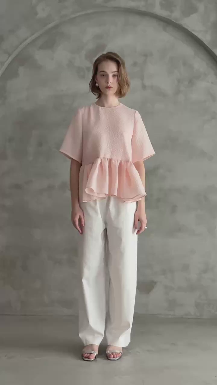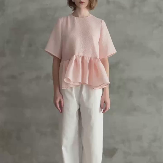 ジャガード織で繊細な凹凸感を表現した、表情豊かな素材を使用したスフレペプラムブラウス。